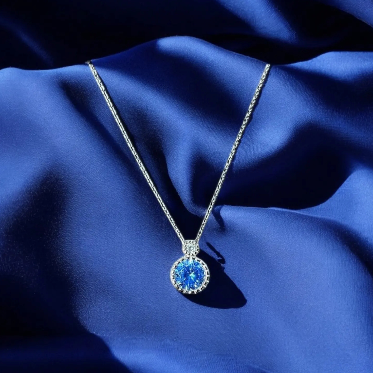 Radiant blue gemstone pendant encased in a sparkling halo setting, this elegant necklace adds a touch of brilliance to any look.