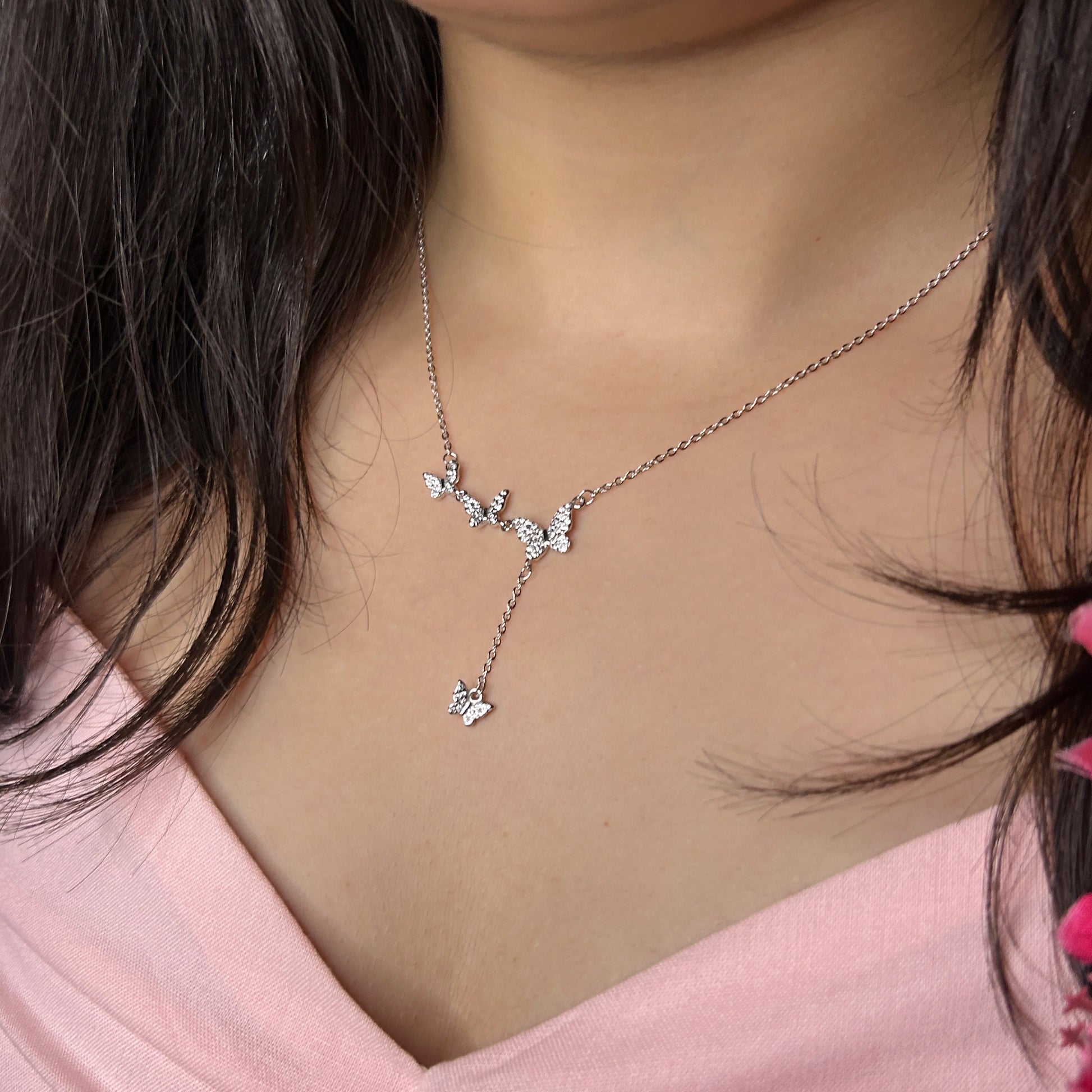 Elegant silver butterfly pendant featuring sparkling details and a delicate drop design, perfect for adding charm and grace to any outfit.
