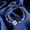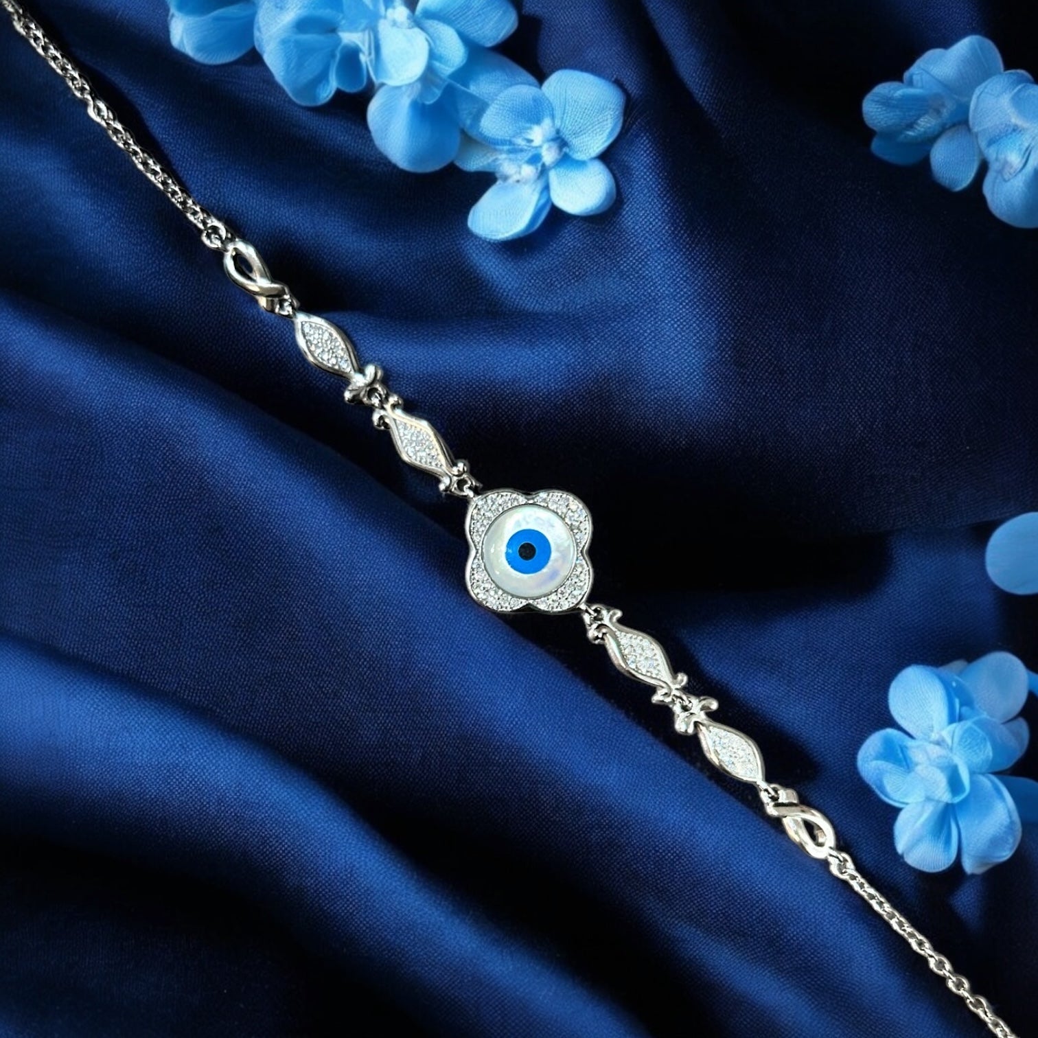 This stunning bracelet features a shimmering chain and an intricate evil eye charm for protection, blending elegance and symbolism into a timeless accessory.