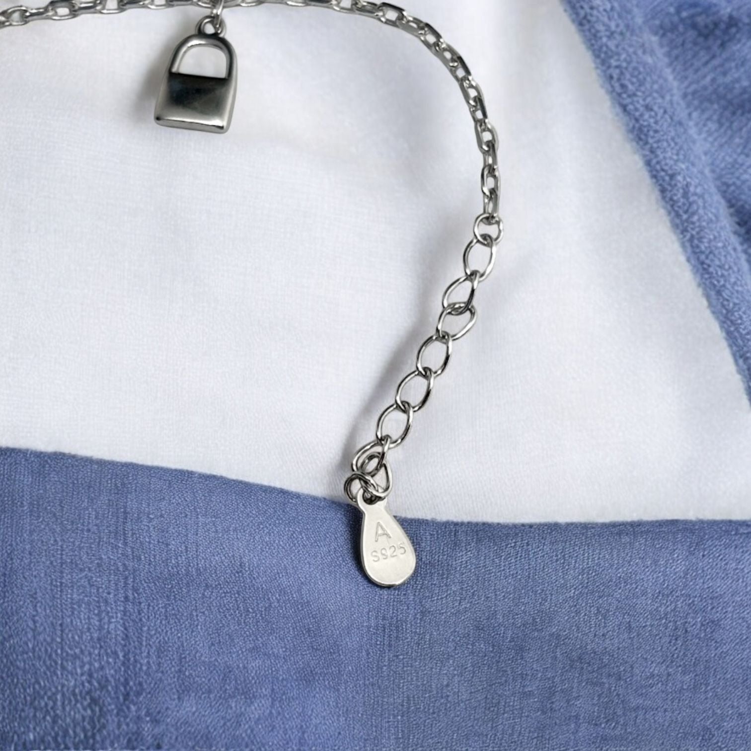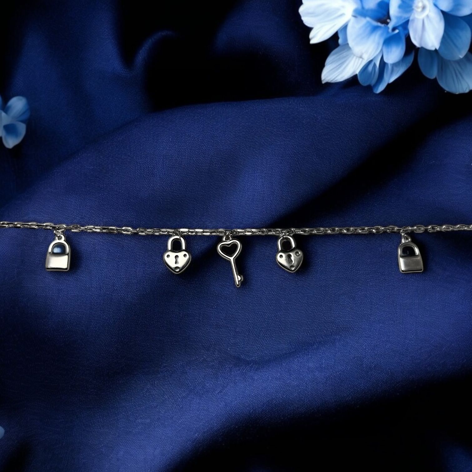 Elegant silver charm bracelet featuring delicate locks, heart-shaped padlocks, and a key, symbolizing love, trust, and eternal connection.