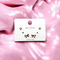 Delicate sterling silver earring set featuring golden bows, sparkling crystals, and classic studs—perfect for adding a playful, elegant touch.