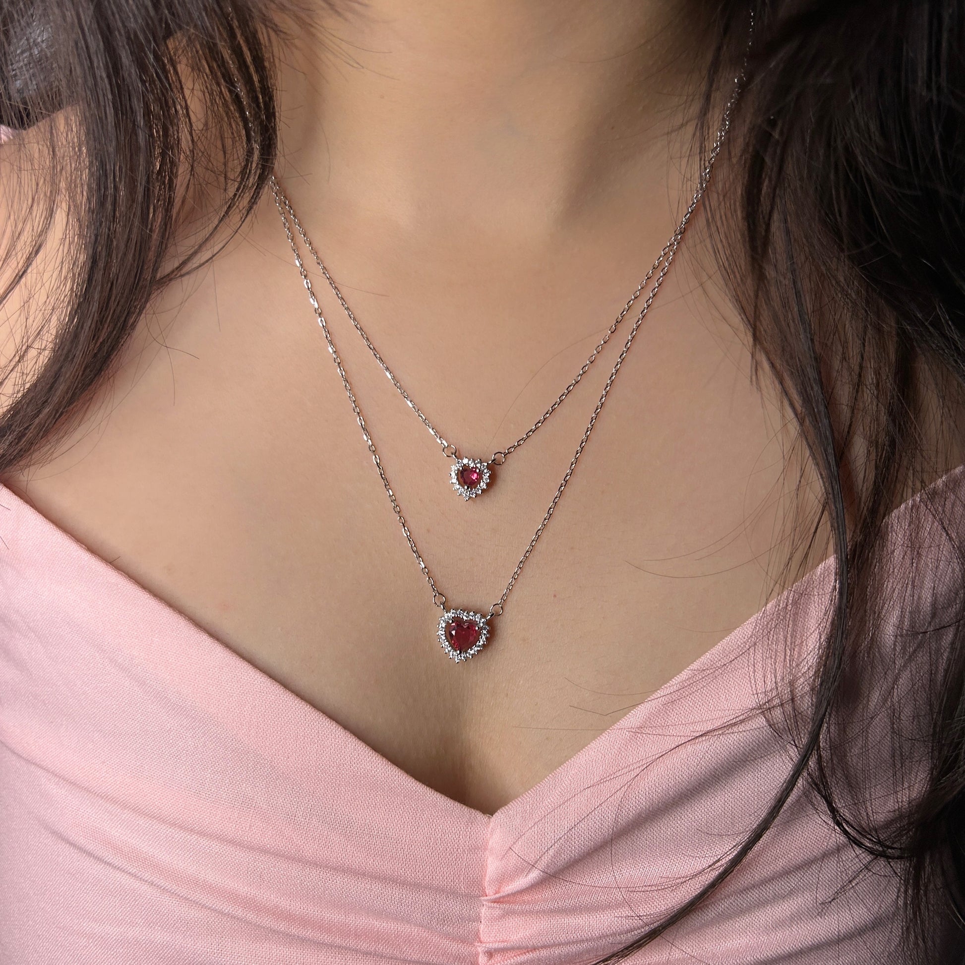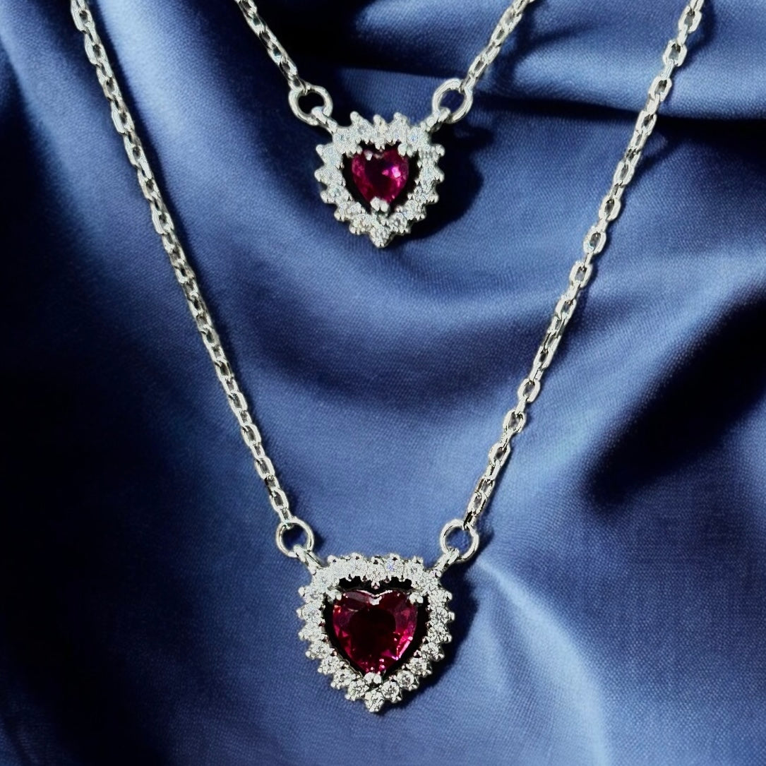 Romantic heart-shaped pendant featuring a deep ruby-red center stone, surrounded by shimmering crystals—perfect for expressing timeless love.